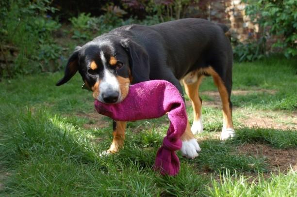 Ganz einfach: Stecke eine leere Wasserflasche in eine alte Socke, knote sie zu, fertig! Durch das knirschende Geräusch macht es dem Hund einen Riesenspaß, darauf herumzukauen.